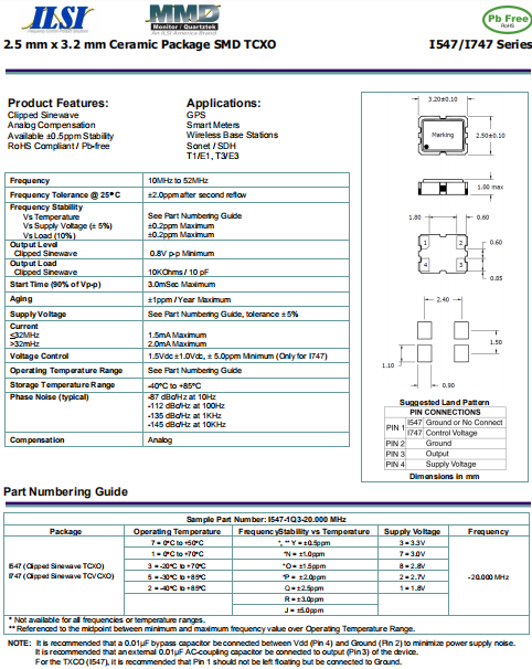ILSI晶振,I547晶振,溫補(bǔ)振蕩器.有源晶振,是只晶體本身起振需要外部電壓供應(yīng),起振后可直接驅(qū)動(dòng)CMOS 集成電路,產(chǎn)品本身已實(shí)現(xiàn)與薄型IC(TSSOP封裝,TVSOP封裝)同樣的1mm厚度,斷開時(shí)的消費(fèi)電流是15 µA以下,編帶包裝方式可對(duì)應(yīng)自動(dòng)搭載及IR回流焊接(無(wú)鉛對(duì)應(yīng))產(chǎn)品有幾種電壓供選1.8V,2.5V,3V3.3V,5V,以應(yīng)對(duì)不同IC產(chǎn)品需要.