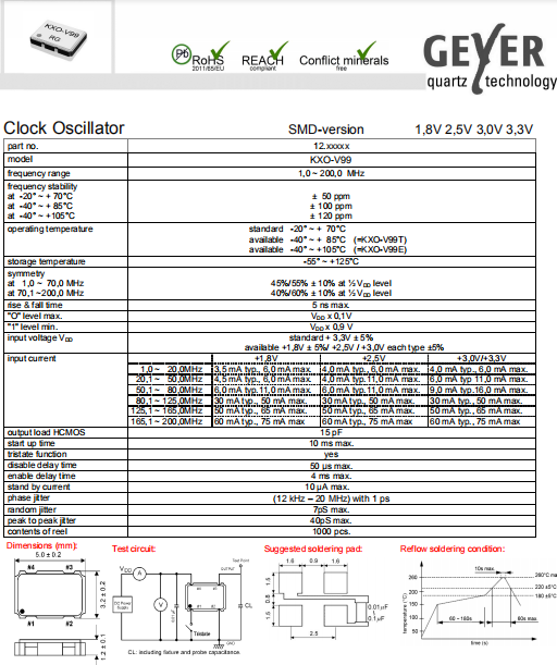 Geyer晶振,KXO-V99晶振,有源晶體振蕩器.小型SMD有源晶振,從最初超大體積到現(xiàn)在的7050mm,6035mm,5032mm,3225mm,2520mm體積,有著翻天覆地的改變,體積的變小也使產品帶來了更高的穩(wěn)定性能,接縫密封石英晶體振蕩器,精度高,覆蓋頻率范圍寬的特點,SMD高速自動安裝和高溫回流焊設計,Optionable待機輸出三態(tài)輸出功能,電源電壓范圍:1.8V~5 V,高穩(wěn)定性,低抖動,低功耗,主要應用領域:無線通訊,高端智能手機,平板筆記本WLAN,藍牙,數碼相機,DSL和其他IT產品的晶振應用,三態(tài)功能,PC和LCDM等高端數碼領域,符合RoHS/無鉛.