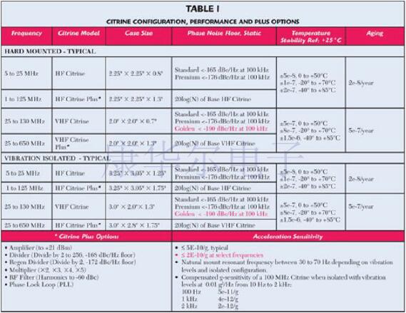 新型Citrine系列晶體振蕩器專為在要求靜態(tài)和動態(tài)條件下具有低相位噪聲性能的最苛刻應(yīng)用提供廣泛的貼片晶振產(chǎn)品.黃水晶振蕩器可以配置為1~650MHz之間的任何固定頻率.黃水晶系列有八種配置.低頻HF振蕩器和VHF振蕩器均可使用,也可以不使用隔振系統(tǒng).而且,“PLUS”系列還提供HF和VHFCitrines,當(dāng)應(yīng)用需要額外的功能時,可添加乘法器,分頻器,放大器,濾波器和雙輸出. Citrine系列具有多種包裝配置,可以根據(jù)頻率,所需的選件,性能規(guī)格和其他應(yīng)用注意事項進行選擇.有關(guān)標(biāo)準(zhǔn)Citrine配置和性能選項,請參見表1. 黃水晶靜態(tài)相位噪聲性能