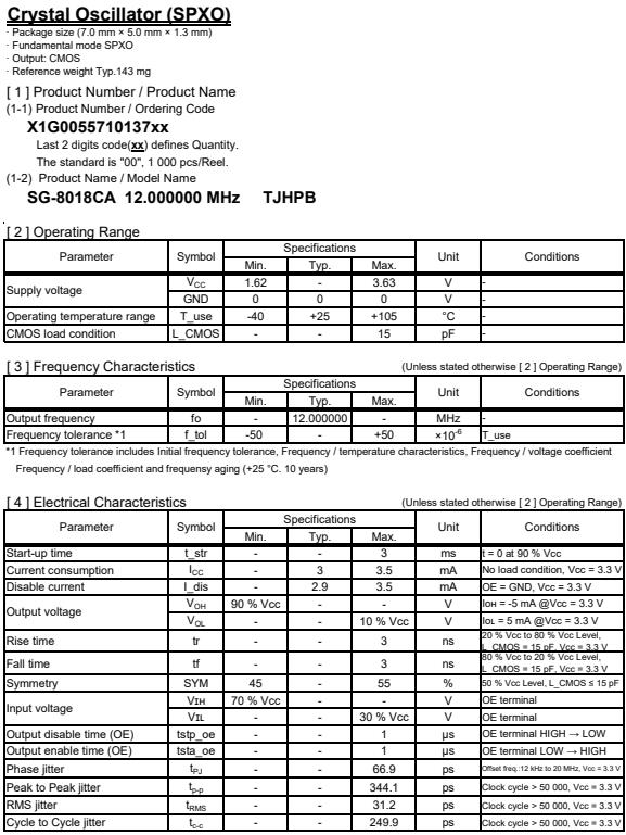 X1G005571013700 | SG-8018CA | 12.000000 MHz | 7.00 x 5.00 x 1.40 mm | CMOS | 1.620 to 3.630 V | -40 to 105 °C |