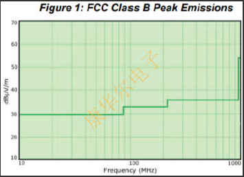 今天,FCC法規(guī)主要關(guān)注給定頻率的峰值發(fā)射,而不是給定頻譜上的平均發(fā)射.因此,電路設(shè)計人員應(yīng)將其EMI設(shè)計工作集中在降低頻譜內(nèi)給定頻率的峰值發(fā)射,而不是頻譜內(nèi)的總體平均發(fā)射.圖1顯示了峰值發(fā)射要求(十米)的FCCB類功率(dBμV/m)與頻率(MHz)的關(guān)系圖.
